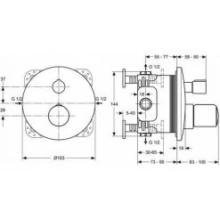 Für Fertigmontage, alle sichtbaren Designteile, mit Umschaltung integrierte Vorabsperrung, Rückflussverhinderer, Rosettengröße Ø 163 mm, Bedienungshebel aus Metall, Thermostat-Kartusche mit Wachsdehnstoffelement, 2-Wege-Absperrventil, Abdichtung mit DICHT-FIX System, Sicherung mit Verbrühschutz und einstellbarem Temperaturbegrenzer, Geräuschverhalten DIN 4109, Gruppe 1