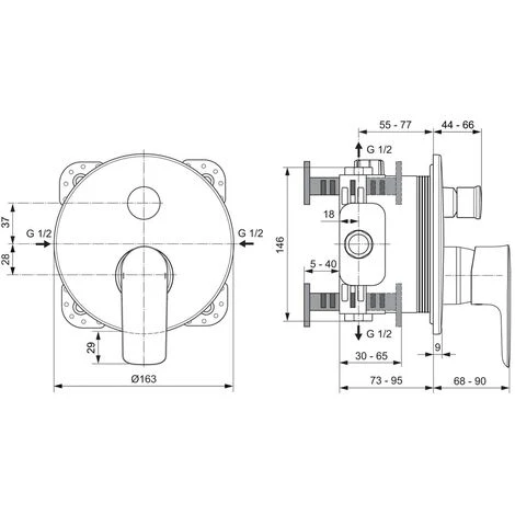 Einhebel-Badearmatur für Wandeinbau. Bausatz 2 für Fertigmontage. Alle sichtbaren Designteile. Rosettengröße Durchmesser 163 mm. Rosette aus Kunststoff. Bedienungshebel aus Metall, mit Rot-/Blau-Markierung auf dem Hebel. Umschaltung automatisch von Brause auf Wanne. Durchmesser 47 mm CLICK-Kartusche mit keramischen Dichtscheiben. Integrierte Heißwasser-Temperaturbegrenzung. Integriertes Fettreservoir (lebensmittelverträglich). Abdichtung mit DICHT-FIX. Lebensdauertest EN 817. Geräuschverhalten DIN 4109, Gruppe 1.