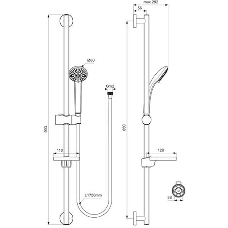S3 Brausekombination 900 mm. 3-Funktionshandbrause Durchmesser 80 mm (Strahlarten: Regen, Platzregen und Massagestrahl). Anti-Kalk-Funktion. Brausestange 900 mm mit schwenkbarem Druckknopf-Schieber. Transparente Seifenschale. Brauseschlauch Metallflex 1750 mm.