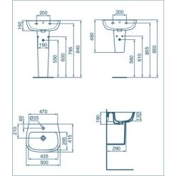 Das vorgeschlagene Waschbecken hat eine Breite von 50 cm und ist mit einer keramischen Halbsäule ausgestattet und für den Einbau von Einlocharmaturen ausgelegt.