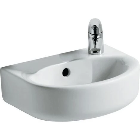 Handwaschbecken 350 mm aus Feinfeuerton. Armaturenbank: 1 Hahnloch seitlich rechts durchgestochen. Befestigung mit 2 Stockschrauben M10 x 140 mm (K710767). Norm: DIN EN 14688 CL 10, DIN EN 31 Oberfläche: Weiß (Alpin) mit Ideal Plus Außenmaße (BxTxH):