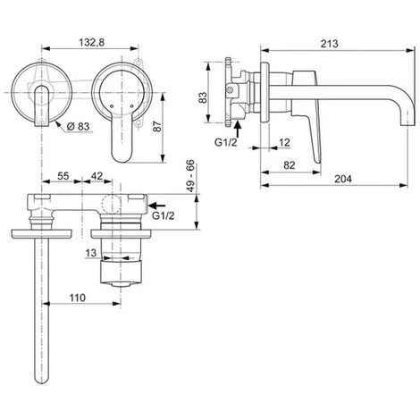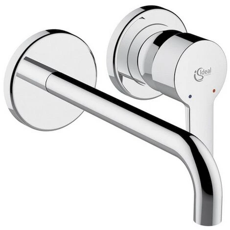 Einhebel-wand-Waschtischarmatur Bausatz 2 für Fertigmontage. Starrer Rohrauslauf und verdeckter Strahlregler. Ausladung 204mmit Bedienungshebel aus Metall. Mit runden Metallrosetten (Durchmesser 83mm). Alle sichtbaren Designteile. Kartusche Durchmesser 4