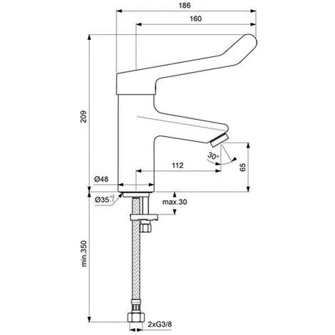 Einhebel Waschtisch-Armatur DN 15 mit Klinikhebel 160 mmit Starrer selbstentleerender, nickelfreier Auslauf, mit vandalensicherem Strahlbrecher (Aerosolarm). Ausladung 112 mmit Auslaufhöhe 65 mmit Nickelfreie flexible Anschlussschläuche. Bedienungshebel