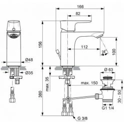 DN 15, starrer Gussauslauf, Sockelmaß 48 mm. Luftsprudler mit Metallring und druckunabhängigem Mengenregler 5 l/min, Zugknopf-Ablaufgarnitur G 1 1/4“, Ausladung 112 mm, Auslaufhöhe 100 mm, flexible Anschlussschläuche G 3/8“, Bedienungshebel aus Metall, mit Rot-/Blau-Markierung auf dem Hebel, Befestigung von unten (EASY FIX) mit Zentrierdichtung, Durchmesser 38 mm CLICK-Kartusche mit keramischen Dichtscheiben, Kartuschenübersetzung aus Edelstahl, Kartuschenschwenkbereich 100 Grad, integriertes Fettreservoir (lebensmittelverträglich), integrierter Heißwassertemperaturbegrenzer, Lebensdauertest EN 817, Geräuschverhalten DIN 4109, Gruppe 1