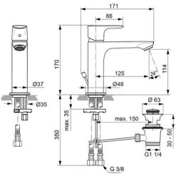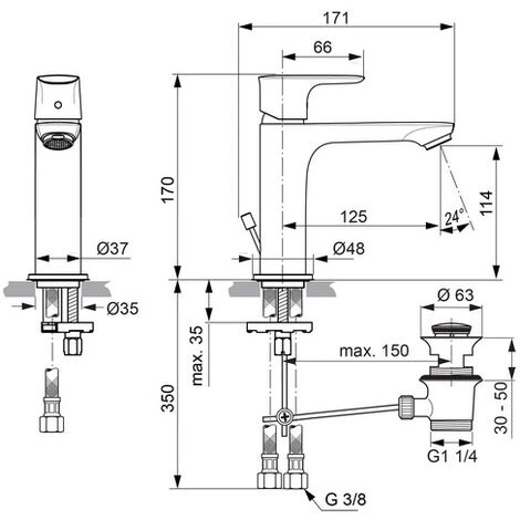 DN 15 mit schlankem Körper, starrer Gussauslauf, Körperdurchmesser 37 mm, Sockelmaß 48 mm, Luftsprudler mit Metallring und druckunabhängigem Mengenregler 5 l/min, Zugknopf-Ablaufgarnitur G 1 1/4“, Ausladung 125 mm, Auslaufhöhe 114 mm, flexible Anschlussschläuche G 3/8“, Bedienungshebel aus Metall, mit Rot-/Blau-Markierung auf dem Hebel, Befestigung von unten (EASY FIX) mit Zentrierdichtung, Durchmesser 25 mm Kartusche mit keramischen Dichtscheiben, Schwenkbereich 90 Grad, Lebensdauertest EN 817, Geräuschverhalten DIN 4109, Gruppe 1